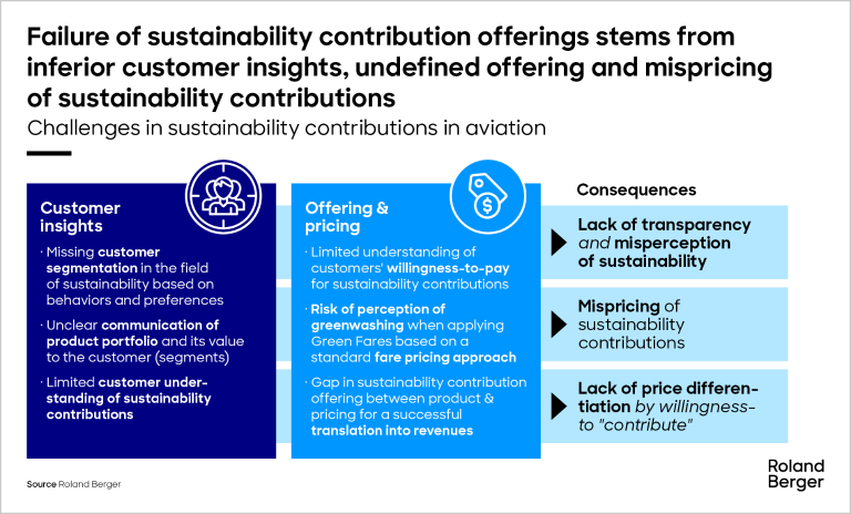 Using proven pricing methods, Roland Berger identified a sweet spot in which sustainability contribution schemes can thrive. Recent studies of ours have shown that asking customers for sustainability contributions of a certain value as part of the general book flow while granting unique services and benefits in return may well appeal to 75% of an airline’s customer base taking up such sustainability contributions. Identifying the right services and benefits that provide high value to customers while only requiring little production costs can generate significant liquidity for an airline’s sustainability contributions.