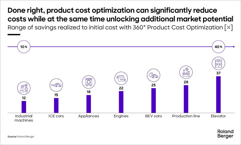 As market pressures rise, more and more manufacturers are realizing that traditional cost-optimization strategies are not achieving the savings they need to gain a competitive edge. So how can companies maximize efficiencies while building a sustainable future? Roland Berger’s ‘360° Product Cost Optimization’ approach offers a solution, unlocking additional savings of up to 30% across the entire product lifecycle.