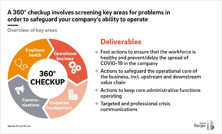 Roland Berger's 360° checkup helps detect operational and organizational risks associated with Covid-19. Pragmatic checklists help you screen four core areas in detail and identify areas where action is needed.