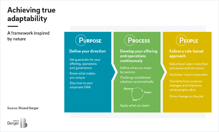 In an era of rapid digitalization, global pandemics and unexpected curveballs being thrown from every direction, change has become the new normal and disruption the only constant. Businesses must therefore become – and remain – increasingly adaptable. In order to help companies to navigate constant complex challenges, Roland Berger has developed a 3P framework, which is inspired by lessons from science and observation from the natural world. This framework is explained in detail in our new Think:Act booklet, “The Adaptable Company”.