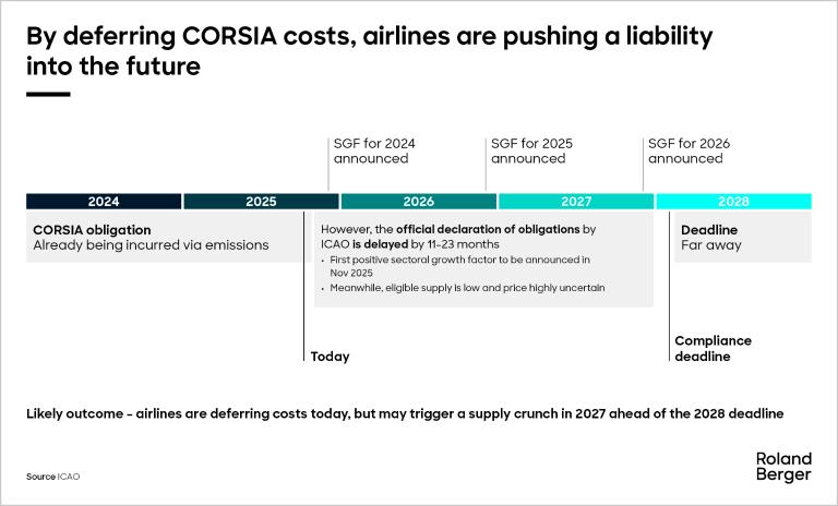 CORSIA’s design does not foster urgency. For each year of emissions, airlines only learn their obligations in November of the following year, creating uncertainty and delays in decision-making. Moreover, the next major deadline—January 2028—still feels distant.