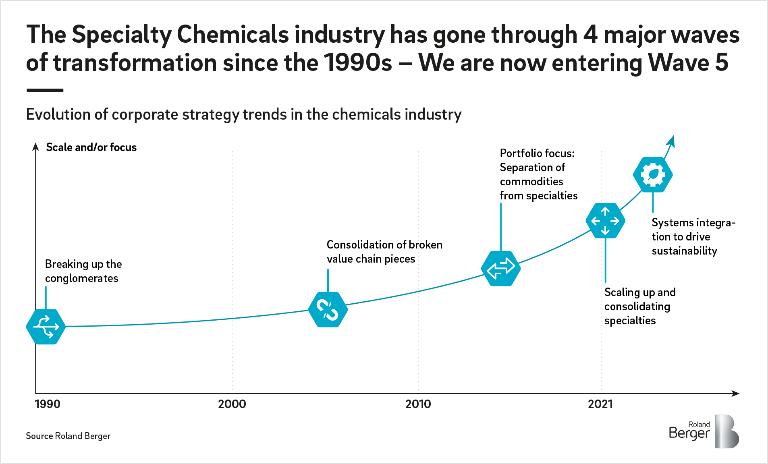 At Roland Berger, our analysis of the chemicals industry over the last 25 years is based on waves of corporate transformation. The first wave in the late 1990s was the separation of the pharmaceutical and chemical businesses. Subsequent waves have seen value chains deconstructed (and sometimes reconstructed) as specialty and commodity business have been separated.