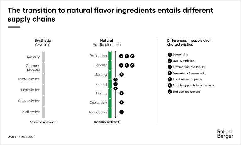 Natural flavor supply chains are fundamentally different from their synthetic counterparts. Take vanillin extract, for instance; it can be synthesized from crude oil or derived naturally from the vanilla planifolia, a flat-leaved vanilla plant. Synthetic production involves industrial processes like refining and hydroxylation, while the pollination, harvesting and sorting in natural production must be done by hand. Consequently, these diverse processes necessitate distinct supply chain requirements. The natural supply chain must accommodate factors such as seasonality, quality variation, raw material availability, and traceability & distribution complexity. Both data & supply chain technology and the end-use of applications are requirements of both production processes, but in comparison natural production requires a vastly different approach.