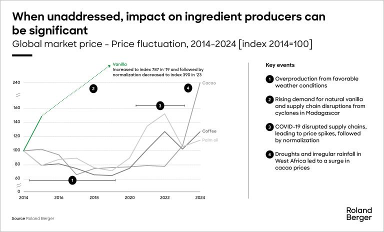 Natural flavor and food ingredients can therefore have far-reaching impact on critical business drivers like price and security of supply. For example, the export price of natural vanilla from Madagascar skyrocketed by almost 700% between 2014 and 2019 due to a combination of rising demand and supply disruptions from cyclones. Similarly, cocoa prices recently surged due to droughts and irregular rainfall, especially in West Africa.