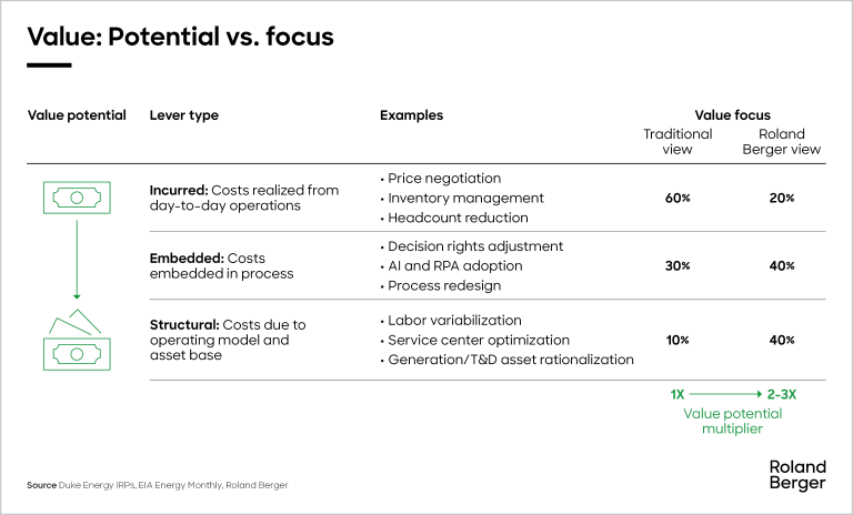 Traditionally companies have focused the majority of their cost management efforts on incurred costs where potential value, while not insignificant, is limited to the way in which the business is currently being run. Roland Berger’s experience suggests that companies should also focus on embedded and structural root causes of cost to deliver maximum value and fundamentally reset the cost curve.
