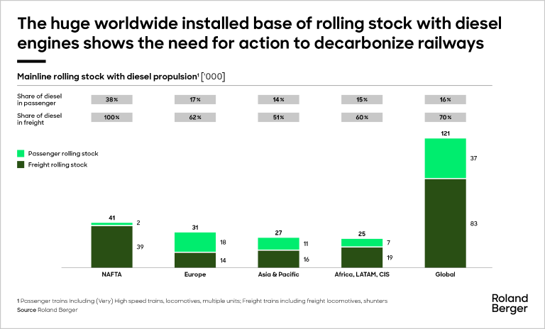 However, many trains worldwide operating on rail networks that have not been electrified are still powered by diesel. In total, roughly 121,000 vehicles – locomotives, shunters and multiple units – still use this form of propulsion. The share of diesel-driven vehicles is particularly high in freight transportation, especially in the NAFTA countries, Australia and Latin America, where large distances are covered by trains without electrification. In the medium to long term, this rolling stock needs to be replaced by vehicles with innovative propulsion systems, to avoid CO2 emissions. But operators cannot put off making the relevant decisions: Rolling stock has a lifetime of 30 to 40 years and units purchased today may be affected by future regulation in the final years of their operation. Indeed, we already see many rolling stock leasing companies (ROSCOs) in continental Europe hesitating to buy new diesel rolling stock.
