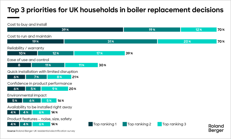 UK consumers have consistently shown that very few are willing to pay a “green premium”, but most will consider a low-carbon alternative if and when that premium is removed. Buying and installing a new gas boiler typically costs around £4,000 for a UK home, whereas a heat pump costs approximately £13,000. In our recent survey of UK households, 58% cited purchase and installation costs as the first or second most important factor when selecting a new heating appliance. No non-financial consideration was selected as the most important by more than 10% of respondents.