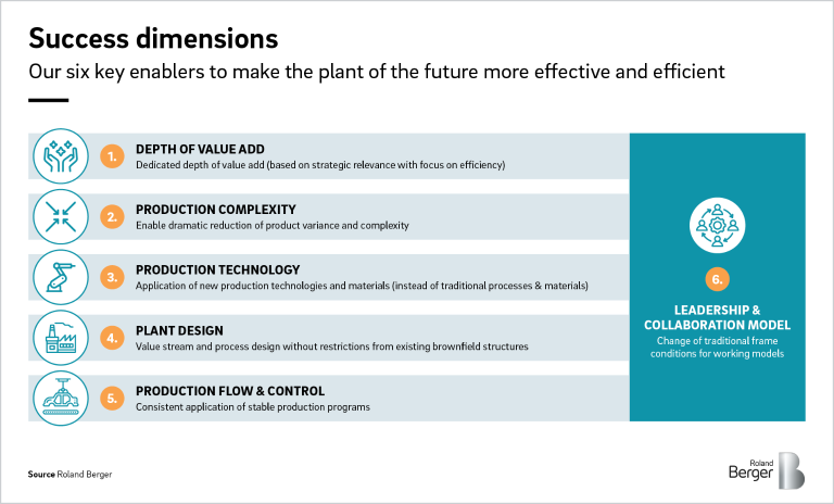 In our report “Future readiness in automotive production” we explore the idea of holistic orientation for cost-efficient production. We assess six success factors, asking questions such as: which factory archetypes should automotive players focus on? To what extent are new product concepts determined by product development and sales? What is the impact of new production concepts on production design and complexity? And how does company culture need to adapt to new concepts? The factors are outlined below, with more details and solutions available in the report itself.