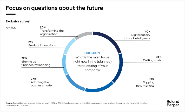 Most executives have understood the signs of the times. Asked about what key future issues are a major focus of current or planned restructuring exercises, 40% cite digitalization and artificial intelligence as their top priority. These topics are followed by conventional cost-cutting (34%), tapping new markets (33%), and adapting the business model (27%).