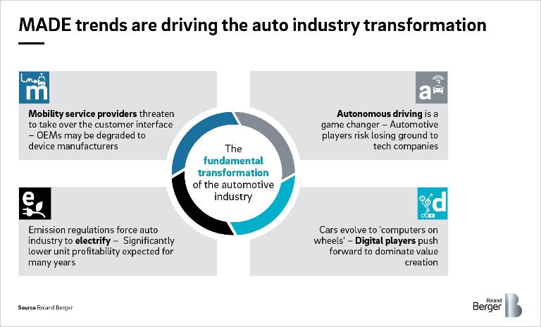 In addition to these global megatrends there is the automotive industry’s own transformation. The shift away from traditional, privately owned and conventionally powered vehicles to future mobility types is unstoppable, and many incumbent OEMs are still behind the curve. Roland Berger’s MADE trends highlight the difficulties.