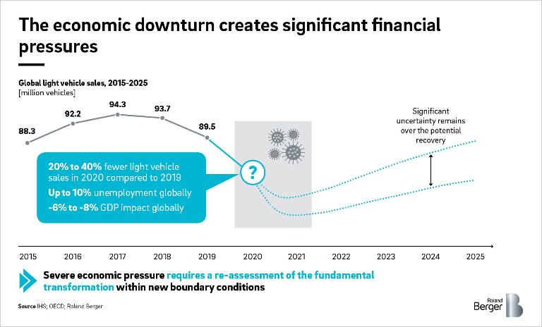 Lastly, the current severe economic downturn means auto companies must completely reassess how they will transform, as their ability to finance the shift declines. In the short term, 20 to 40% fewer light vehicles could be sold in 2020 compared to 2019 due to the ongoing crisis and, longer term, there is significant uncertainty about when pre-2020 sales levels will be achieved again.