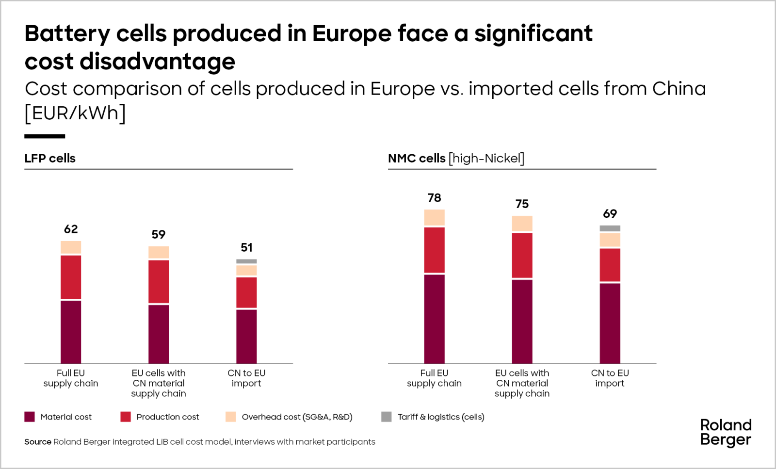 Locally produced battery cells are projected to face a significant cost disadvantage, estimated at approximately 9-11 EUR/kWh compared to cells produced and imported from China. This gap stems from structural disadvantages in capital and operating expenditures that affect both new domestic entrants and established Asian players producing in Europe.