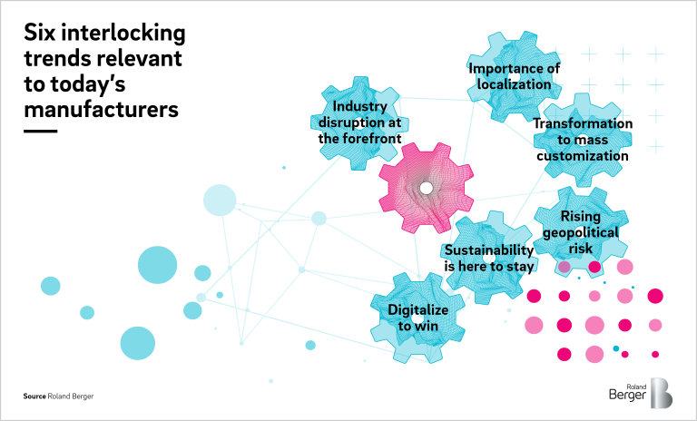 To better understand how manufacturers are making sense of it all, we looked specifically at six interlocking trends of most relevance to manufacturing today. They include sustainability, digitalization, geopolitical risk, localization of production and/or supply chains, customization of products, and industry disruption (new business models, technology disruption, talent shortages).