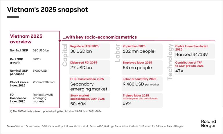 The stakes are high. Vietnam’s transformation over the past four decades has been nothing short of extraordinary, moving from an agrarian society to a global manufacturing powerhouse. Yet, as we at Roland Berger see it, the very engines that powered this ascent are now reaching their limits. The next phase will demand a fundamental shift in strategy, execution, and mindset.