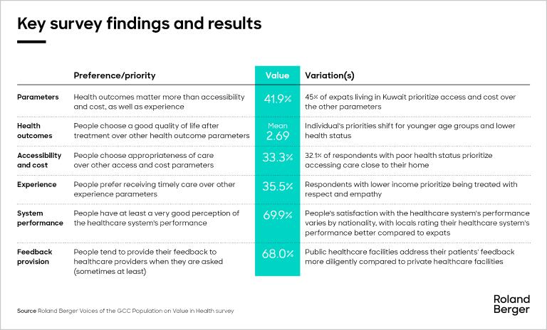 In this context and given the limited availability (if any) of this type of information in GCC, Roland Berger Middle East (RBME) collaborated with the VIH in Kingdom of Saudi Arabia (KSA) on launching a first-of-its-kind survey targeting GCC region, with an emphasis on KSA and United Arab Emirates (UAE). The goal of this survey is to understand what people value the most across and within the key dimensions of health outcomes, accessibility andcost, and experience when seeking healthcare services in their country of residence. We identified variations in respondents’ preferences based on their country of residence, age, gender, income, education, utilization of health services in the last year by care settingand facility type, and overall health status. We highlighted key survey findings and results inthe table below: