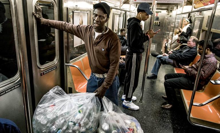 NYC is no.1 producer: It has a population of 20 million and is the world's biggest producer of waste – 33 million tons per year. This " canner" makes about $20 a day picking up cans for the 5¢ deposit each carries, although the practice is not strictly legal.