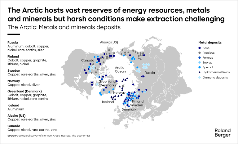 As the ice retreats, minerals in the Arctic that are needed for the green transformation of the economy, such as cobalt, lithium, nickel, and rare earths, are becoming more accessible. Greenland alone holds 43 of the 50 minerals classified as "critical" by the US government, including 42 million tons of rare earths - 120 times the world's output in 2023. However, most deposits remain unmapped, and large-scale extraction is likely a decade away due to the harsh conditions. The region is also home to an estimated 13% of the world's undiscovered oil and 30% of its untapped natural gas reserves.