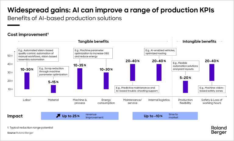 In operations and manufacturing, AI can bring efficiency gains beyond automation by unlocking value across the entire value chain. The latest developments in AI enable new use cases that can significantly improve a wide range of production KPIs, leading to improvements of up to 25% in revenue and up to 10% in time to market.
