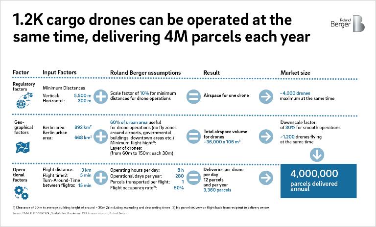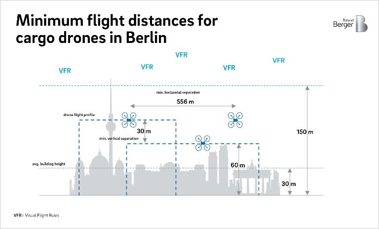 Berlin covers 892 km2, of which 668 km2 is built up and the rest is covered by lakes and forests. After factoring in no-fly zones around, for example, government buildings, airports and the city center, we assume approximately 60% of the urbanized area is available for drone operations. We further assume a maximum of three drone flight layers. The lowest would start at 60 m above ground (so as to avoid most buildings) and the highest would have a ceiling of 150 m above ground (so as not to interfere with small aircraft flying under visual flight rules).