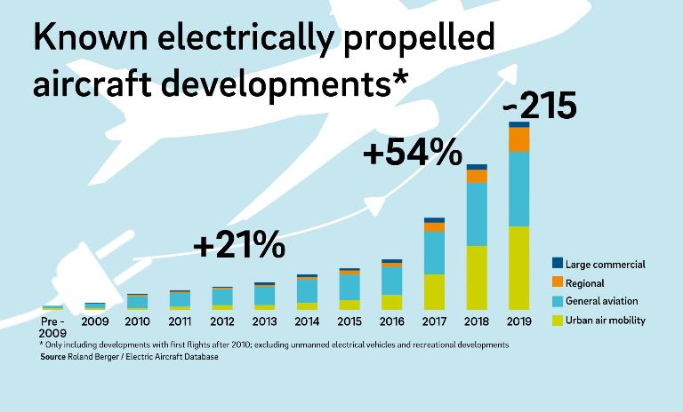 The number of electrically propelled aircraft developments grew by ~30% in 2019