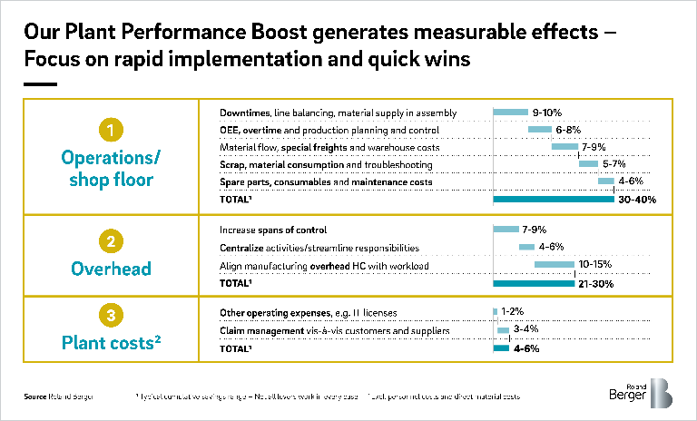 The approach focuses on rapid implementation and quick wins, with impressive results typically achieved in the three target areas. In operations/shop floor, savings of 30-40% are achievable by, for example, addressing downtimes, warehouse costs as well as quality and maintenance costs. Overheads can be cut by 20-30% by streamlining management structures, bundling support functions and rebalancing workloads, for instance. And shedding unnecessary IT licenses and reducing facilities management expenditure helps reduce plant costs by 4-6%. The foundations for these savings can be built in less than three months.