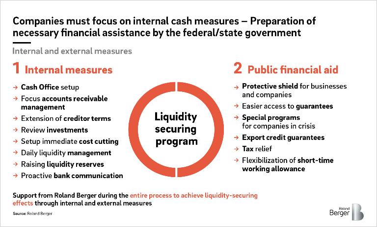 Roland Berger's program to secure liquidity gives businesses the tools to implement internal and external measures at just the right time to remain solvent in a crisis or special situation. For many companies, establishing a Cash Office will be a necessary basis for securing liquidity. And then there are external measures such as the possible utilization of state aid, especially in the coronavirus crisis (KfW and guarantee programs). What is important is that at the end of the process all of the measures work together to provide companies with the liquidity they need.