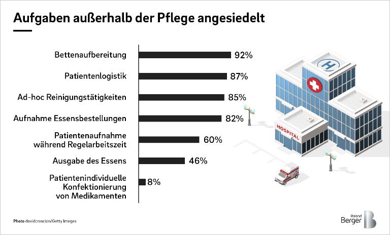 Eine Möglichkeit die Belastung für Pflegekräfte zu verringern, ist, pflegeferne Tätigkeiten von anderen Berufsgruppen ausführen zu lassen. Rund 92% der befragten Krankenhausmanager geben beispielsweise an, dass die Bettenaufbereitung in ihrem Haus von Kräften außerhalb der Pflege vorgenommen wird. Weiterhin werden Aufgaben wie Patientenlogistik, ad-hoc Reinigungstätigkeiten, die Aufnahme von Essensbestellungen sowie die Patientenaufnahme während der Regelarbeitszeit in den meisten Krankenhäusern ebenfalls nicht mehr von Pflegekräften ausgeführt. Unter den in der Umfrage genannten Aufgaben ist lediglich die Konfektionierung von Medikamenten noch überwiegend feste Aufgabe der Pflege. Zusammenfassend zeigt sich, dass sich Pflegekräfte in Krankenhäusern aktuell zunehmend auf die "Arbeit am Patientenbett" fokussieren und medizinisch-unterstützende, fachliche Aufgaben erfüllen. Hingegen werden bzw. wurden pflegeferne Tätigkeiten, wie z.B. der Stationsservice, bereits zunehmend an andere Berufsgruppen abgegeben. Krankenhäuser müssen hier beachten, dass eine stärkere Arbeitsteilung auch immer klarer Verantwortlichkeiten und Prozesse sowie einer intensiven Abstimmung aller Beteiligten bedarf.