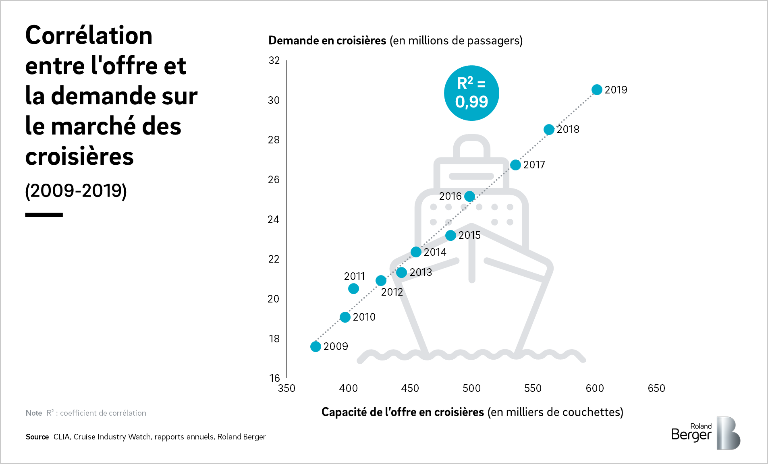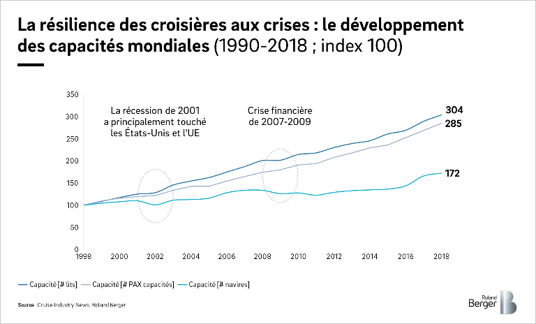 Ces facteurs expliquent que, à la différence d‘autres secteurs touristiques, la croissance de la demande pour les croisières ait pu être historiquement régie par les capacités disponibles, qui ont cru continument malgré les crises économiques. Avant la crise liée à la Covid-19, les armateurs étaient particulièrement rentables avec des marges d‘EBITDA autour de 30%, qui leur ont permis de réinvestir continuellement dans des nouveaux navires et, ainsi, de maintenir une proposition de valeur élevée.