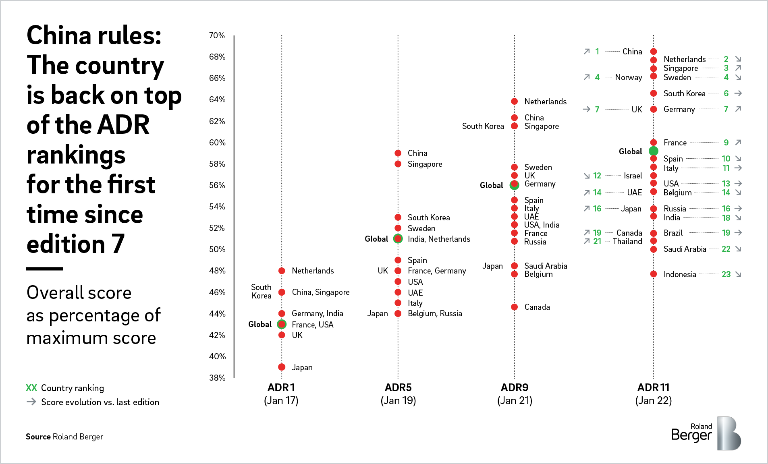 China has been a strong performer in the ADR series since its inception in 2017. It finished top in editions 2-7 and has always been in the top three. After losing its crown to the Netherlands, ADR11 marks a full return to form. The Netherlands hasn’t given up the fight though. It also performed well in the EV-related indicators, scoring particularly well in the number of EVs sold as a percentage of total vehicle sales (25%) and in the density of charging stations (second only to South Korea).