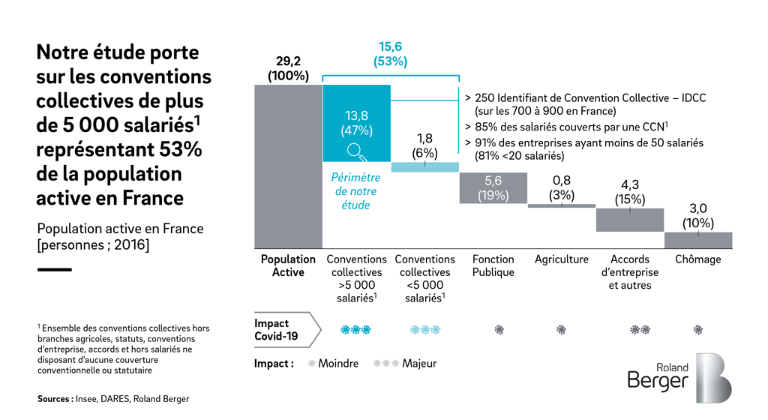 Nous avons analysé les données des 249 Identifiants de Conventions Collectives (IDCC) de plus de 5 000 salariés, correspondant à 13,8 m de salariés en France (près de 50% de la population active).