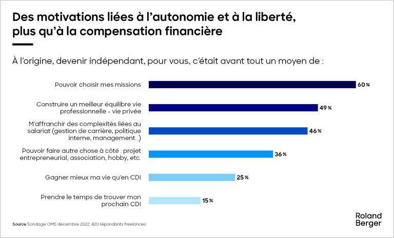 Le freelancing est devenu un choix de carrière viable pour de nombreux professionnels hautement qualifiés. Cette tendance est alimentée par une combinaison de facteurs qui modifient la dynamique du marché du travail : accès simplifié à ce statut, acceptation sociale en hausse, et évolution des entreprises sur ce sujet. Ce choix de carrière d’indépendant est motivé par des facteurs qui vont bien au-delà de la simple rémunération : pour la majorité de ces indépendants, la liberté de sélectionner leurs missions en fonction de leurs intérêts est la principale source de motivation (60%). Cette autonomie dans le choix des projets est une liberté précieuse qui attire de plus en plus de professionnels. En outre, 49% des freelancers considèrent le freelancing comme une opportunité d'obtenir un meilleur équilibre entre leurs vies professionnelle et personnelle.