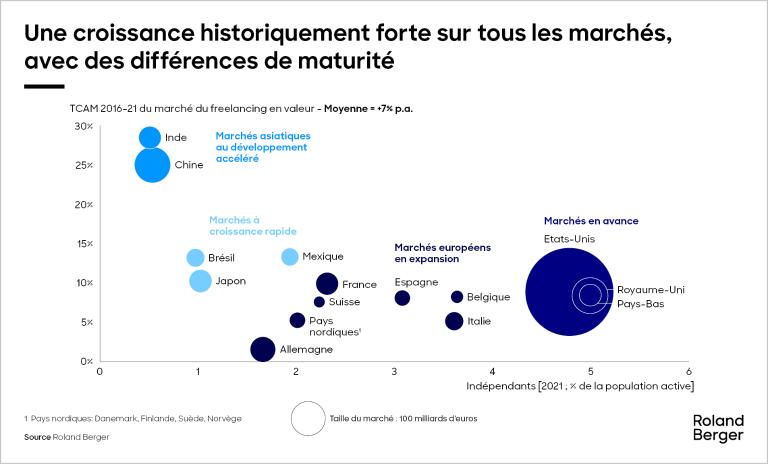 La croissance des marchés matures demeure soutenue, avec une moyenne de 7% entre 2016 et 2021, ce qui témoigne de la pérennité de cette tendance. Les États-Unis ont ainsi une population de près de 7,3 millions de freelances, tandis que l'Europe compte 5,4 millions de freelances. Le freelancing gagne également du terrain en Chine, avec 4 millions de freelances, un marché encore en développement. On observe également un rattrapage rapide des grandes économies, telles que la Chine, l'Inde et le Japon, ainsi que d'Amérique du Sud, notamment le Mexique et le Brésil, montrant que le phénomène s'est largement globalisé.