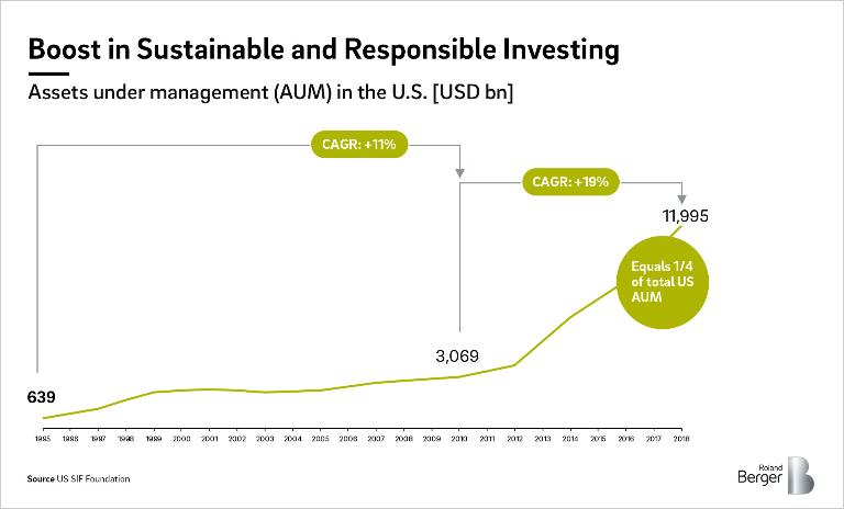 - Second, the role of financial markets. A very prominent example of this is the letter from Larry Fink (CEO of Blackrock) to portfolio companies, in which he insistently demands a commitment to sustainability. Many investors feel similarly and incorporate their values in their investment choices. Unsurprisingly, assets under management of funds incorporating sustainability principles have experienced significant growth over the last decade (compound annual growth of 18.6% in 2010-2018 in the US) and there is no end in sight.