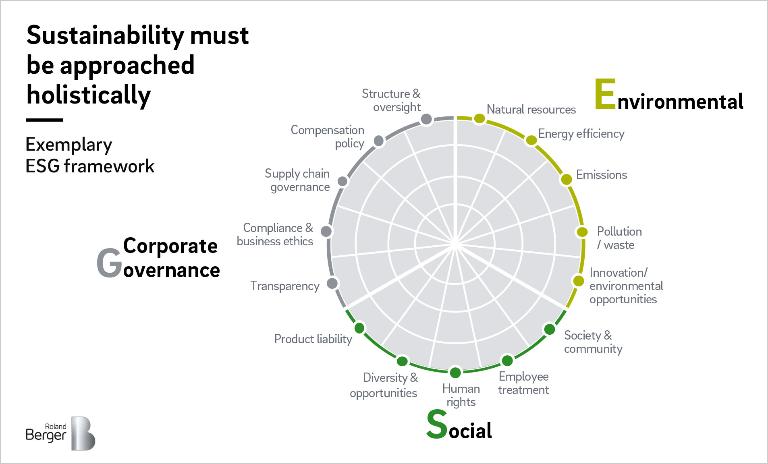 Sustainability is a broad field that covers much more than just greenhouse gas emissions. Consequently, it must be approached from a holistic perspective. At Roland Berger, we, like many others around the world, define sustainability along three major dimensions: environmental, social and corporate governance aspects – ESG for short.