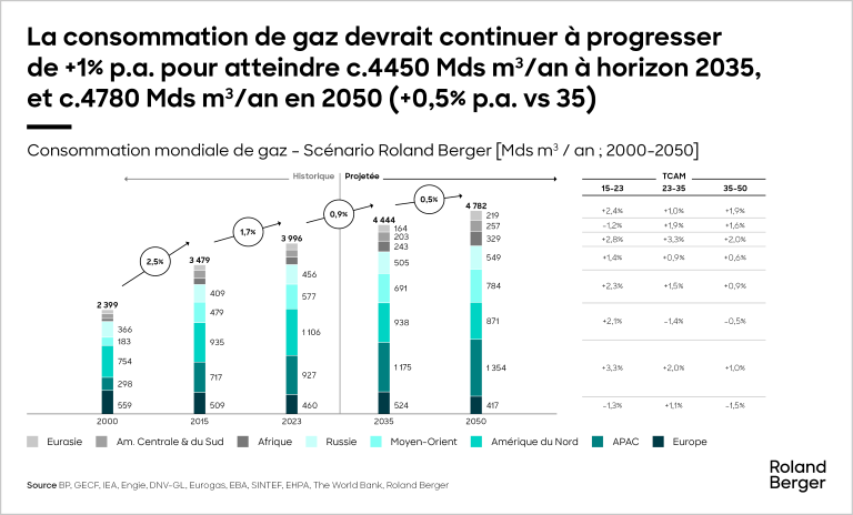 Le scénario Roland Berger (4 782 Mds de m³ en 2050, soit +0,7% par an depuis 2023) présente une vision haute de la consommation de gaz, plausible mais non souhaitable (proche du scénario Rystad Energy 2,2° basé sur des émissions de CO2 provoquant un réchauffement climatique de 2,2°C).