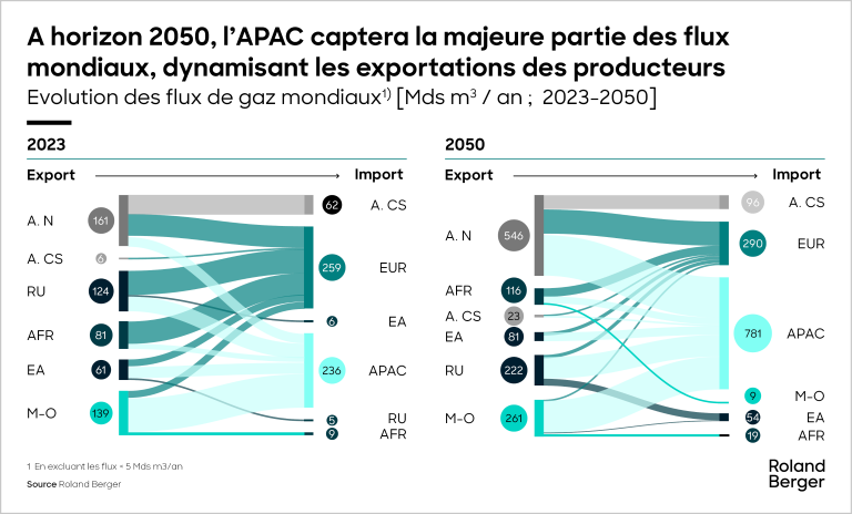 Les scénarios de référence anticipent une consommation mondiale de gaz fossile entre ~2500 Mds m³ / an en 2050² et ~5400 Mds m³ / an³) représentant respectivement une baisse de -1,9% et une hausse de +1,0% p.a. de la consommation de gaz fossile depuis 2023.