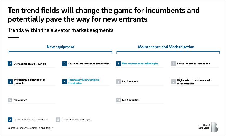Roland Berger has identified ten trend clusters along the elevator market value chain that will further impact the market overall, as well as each participant's product and service offering. In this article, we will be highlighting two trend clusters in more detail: technology and innovation in installation, and new maintenance technologies.