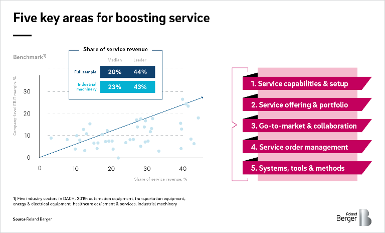 We identify five key areas in which players can boost their services and in so doing turbocharge their revenues: service capabilities and setup, service offering and portfolio, go-to-market and collaboration, service order management, and systems, tools and methods. In the area of service capability and setup, to take one example, they can consolidate their service activities and competences by setting up hubs for their operations, thereby reducing organizational complexity and avoiding redundancy in capabilities. As part of this, they should consider implementing strict first, second and third-level support structures, customer interfaces and helplines, while aligning their procedures and best practices by introducing standard processes.