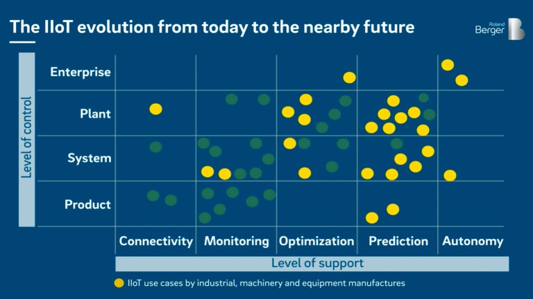 The animated graphic below summarizes what we discovered from conducting more than 40 interviews with company representatives and industry experts. The graphic shows current IIOT use cases and how they are evolving over time . For each use case, we plot the level of support provided (connectivity, monitoring, and so on) against the level of control (product, system, plant or enterprise).