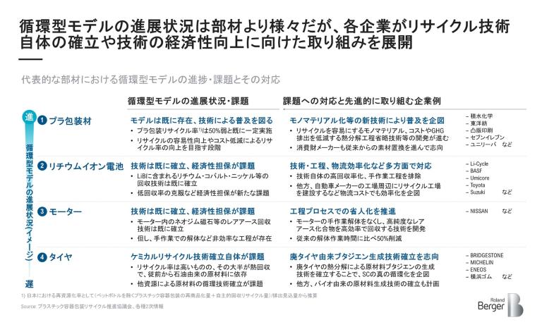 種々の部材分野の中でも、包装・容器分野は比較的循環型モデルの取組が進展してきたが、下記で見るように、相対的に技術開発や回収システム確立が遅れてきた電池・モーター・タイヤ等の分野でも経済合理性の壁を打ち破るべく先端的な取組が点に注目したい。