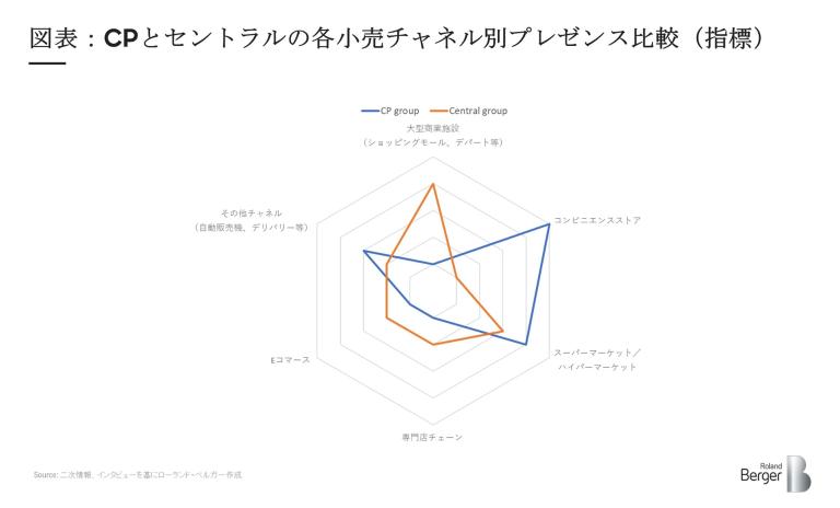 図表は小売市場のサブセグメント毎にCP、セントラルのプレゼンスの強さを弊社が指数化したものだ。CPはセブンイレブンをはじめとしたコンビニ市場で圧倒的に強く、既に同市場で8割近いシェアを持つ。更には、ロータス買収によってスーパーマーケット/ハイパーマーケット市場でのシェアも3割近くにまで高めた。
