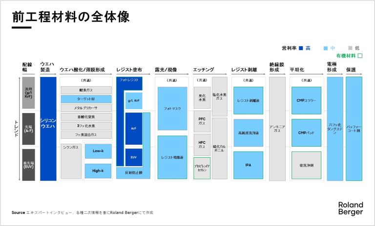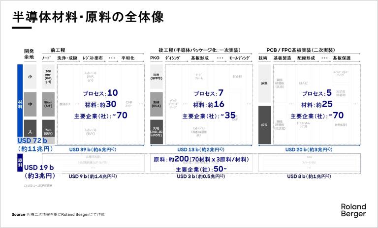 また、原料は、前工程・後工程・実装工程の各工程合計で、延べ200以上の原料が存在する見立てであり、市場規模は約3兆円で、50社以上の主要企業が参入している。これら主要企業には、汎用品は大企業中心の供給体制も、ニッチ領域特化の中堅・中小プレイヤーも一定存在している。また、EUV露光に対応したフォトレジストポリマーなど、微細化、高集積化、低誘電/高放熱といった技術トレンドへの対応を要する原料が高い成長性を有すると考えられる。