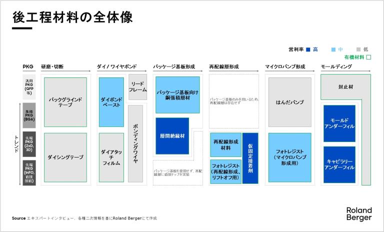 後工程材料は、ウエハのチップ化からパッケージ化まで、大きく7プロセス、16の主要材料が存在し、市場規模は約2兆円で、35社程度の主要企業が参入している。大きな傾向として、層間絶縁材や仮固定接着剤など、後工程の高集積化に対応して進化が必要な材料群が、高い成長率・収益率を有している。