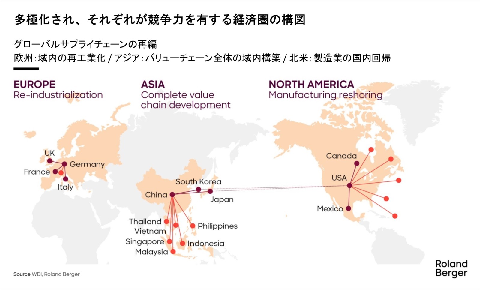 近代史の大部分においては、産業移転がグローバリゼーションを進歩させてきました。そして、それが繰り返されるごとに国境を越えた統合が深まり、各地域に明確な役割を委ねてきました。そこでは、米国とヨーロッパがハイエンドな研究開発と設計を独占し、アジアは中低価格帯の製造能力を提供しました。この枠組みは、効率性と規模を可能にしたものでしたが、今や崩壊しはじめています。金融危機を発端に、COVID-19以降はより顕著に、効率性よりもレジリエンス(回復力)が追求されるようになり、優先事項であったシームレスなグローバルフローは、安全な地域ネットワークと置き換わっています。この過程で、3つの異なる重心が浮上しました。北米は製造業を国内に回帰させ、ヨーロッパは再工業化を目指し、アジアは世界の工場としての役割を超えて、域内でのバリューチェーンと産業エコシステムを構築しようとしています。これらの変化が相まって、現在、多極化したグローバルサプライチェーンの基盤が築かれつつあるのです。