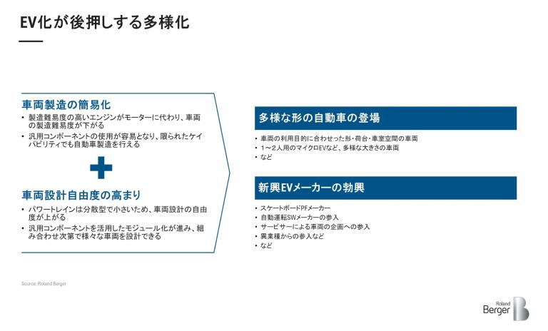 設計・製造の簡易化とパッケージングの自由度の高まりは、多様な形の自動車を生み出す。つまり、自動車の利用目的に応じた大きさや形、車室空間や荷台の作りが実現される。例えば2人乗りのマイクロEVや、ラストワンマイル物流に使いやすいバンなどである。また、既存自動車メーカーとは異なる新興EVメーカーの出現が進む。ユーザーのニーズに応える事業アイディアや車両アイディアを持った新興プレイヤーが、この自動車市場に参入する機会が増える。