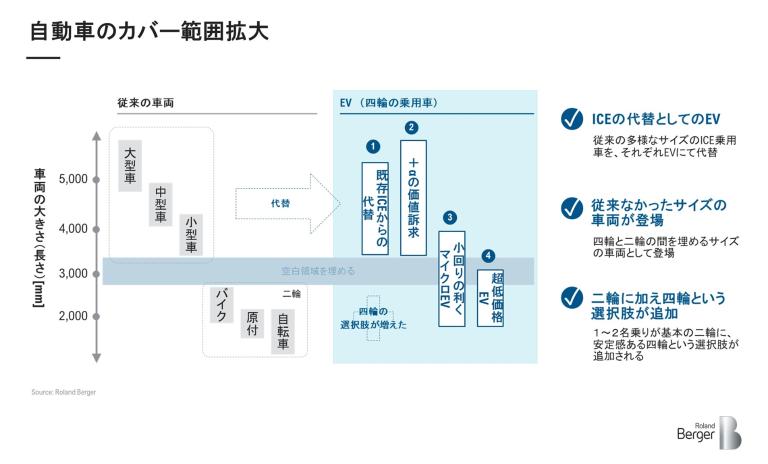 まず、多様なモビリティを「大きさ」の観点で捉えたい。これまでは、自動車(四輪車)の大きさに対して、より小さなサイズをバイクや自転車といった二輪車がカバーしていた。EVの出現は、従来の四輪ガソリン車を置き換えるだけでなく、小回りの利く手軽な大きさで、かつ四輪だからこその安定感を両立する、新たなモビリティを生み出している。