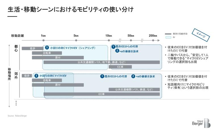 つまりは、エンドユーザーにとって、多様な移動手段が出現しているということだ。となると、これからは「自動車市場」という観点だけでは市場を見誤る。「移動総量」を市場の全体像として捉え、多様なモビリティ(自動車、電車、バス、eスクーター、自転車、徒歩、等)がその移動総量を取り合う。エンドユーザー目線で言うとシーンに応じてモビリティを使い分ける、と捉えることが必要である。