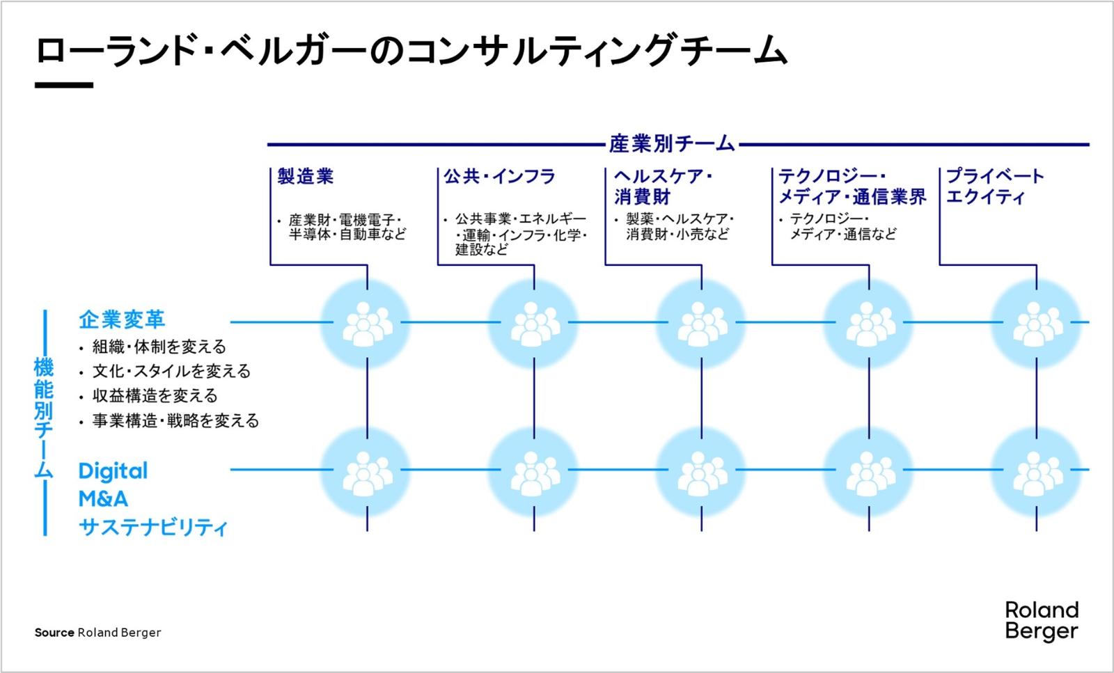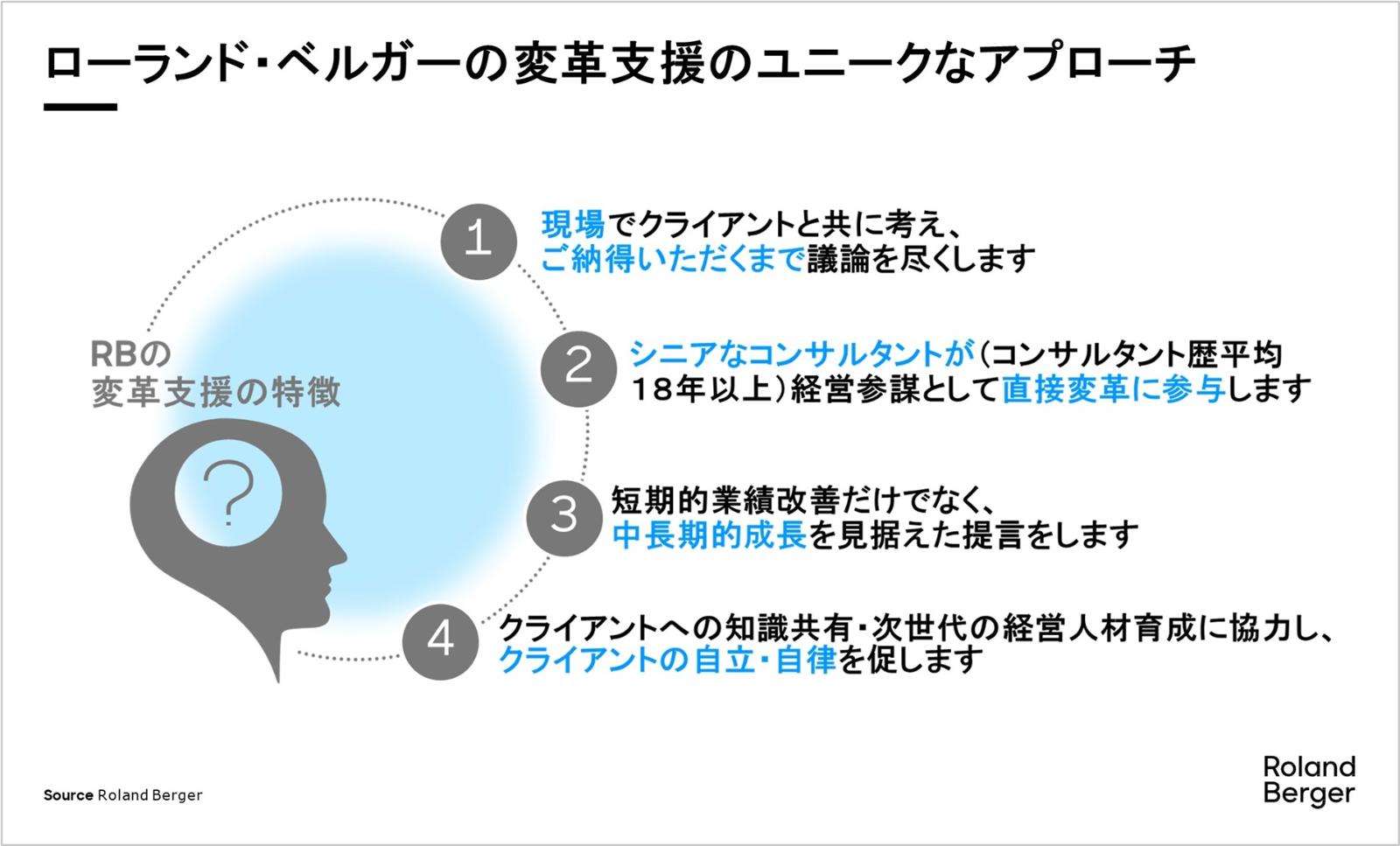 収益構造の見直しや、事業構造・戦略、組織体制の検討、時には企業風土・文化など、企業自らが現状からの脱却や進化を必要とされる時、ローランド・ベルガーではそのすべてを「変革」と捉え、欧州・グローバルにおいて培ってきたノウハウと最高レベルのコンサルタントによる英知を駆使し、短期的・画一的な改善ではない、中長期視点のテーラーメイドな企業変革支援を提供いたします。
