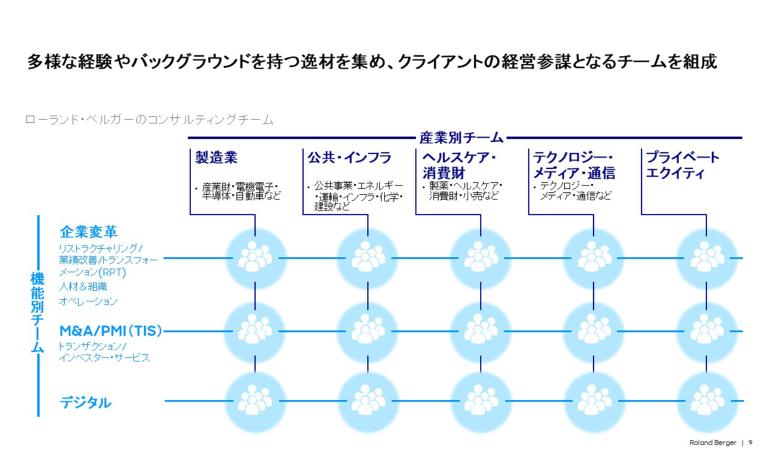 収益構造の見直しや、事業構造・戦略、組織体制の検討、時には企業風土・文化など、企業自らが現状からの脱却や進化を必要とされる時、ローランド・ベルガーではそのすべてを「変革」と捉え、欧州・グローバルにおいて培ってきたノウハウと最高レベルのコンサルタントによる英知を駆使し、短期的・画一的な改善ではない、中長期視点のテーラーメイドな企業変革支援を提供いたします。