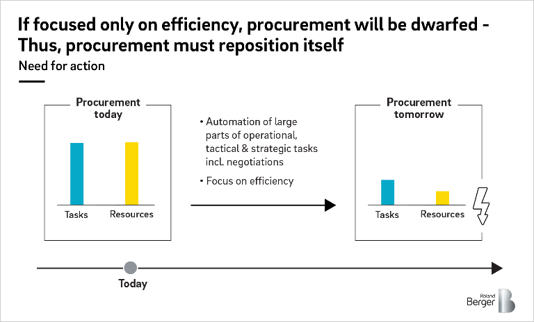 Here it is important to caution that digitalization should not be misunderstood as automation with a focus on efficiency. As Klaus Staubitzer, the Chief Procurement Officer at Siemens AG, has said, "In most companies, digitalization is understood as automation and that is completely wrong". If procurement only focuses on automating its processes to become more efficient, the function will be dwarfed by many others in the organization. Without a repositioning, procurement will wind up drained of resources and responsibilities.